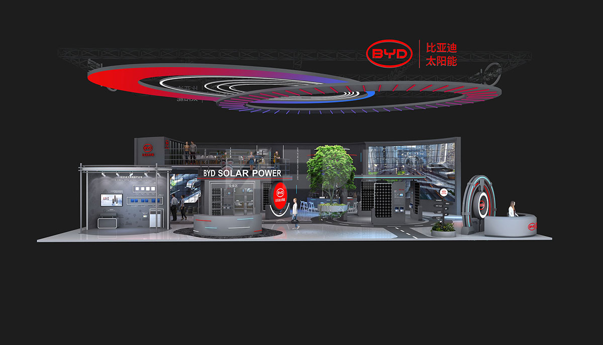 本次"比亚迪太阳能"展位在上海新国际展览中心E1馆-310,占地面积为500㎡,展位红蓝渐变色彩的强烈碰撞、大面积灰色调的运用,彰显了比亚迪太阳能创新、大胆、前卫的展台设计风格,体现了比亚迪太阳能勇于进取的精神,